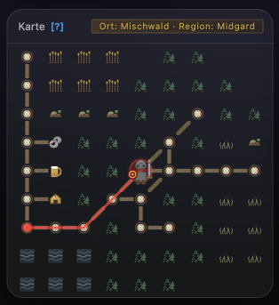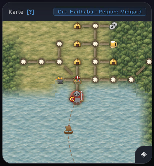 Neu: Die Karte bietet nun zwei Darstellungsmodi: Im Visual-Modus werden Terrain, Wasser und Wälder als nahtlose Texturen gerendert, während der Icon-Modus eine klassische, übersichtliche Symboldarstellung zeigt. Zwischen beiden Modi kann jederzeit über den Button unten rechts in der Karte gewechselt werden oder über Settings (Zahnrädchen) oben rechts im WebClient. Fährt man mit der Maus über einen Raum, erscheint dessen Kurzbeschreibung als Tooltip. An Häfen zeigt eine animierte Schiffsroute mit fahrendem Schiff die Verbindung übers Meer — ein Mouseover auf die gestrichelte Linie oder das Schiff verrät das Reiseziel. ✧ WebClient Exclusive