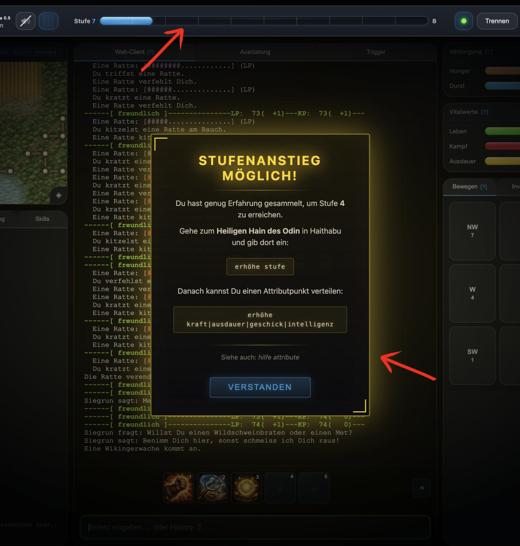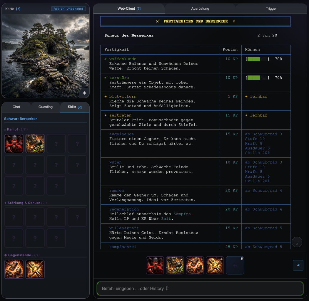 Neu: Der Midgard MUD Web-Client ist jetzt fertig und bereit für dich. Er läuft direkt im Browser – keine Installation, kein Aufwand, keine Kosten, einfach losspielen. Optimiert für Tablets, Laptops und Desktop-PCs ab 768×1024 Pixeln bzw. ab 8 Zoll. Wenn du ein passendes Gerät hast: Jetzt ist der perfekte Moment, einzutauchen.