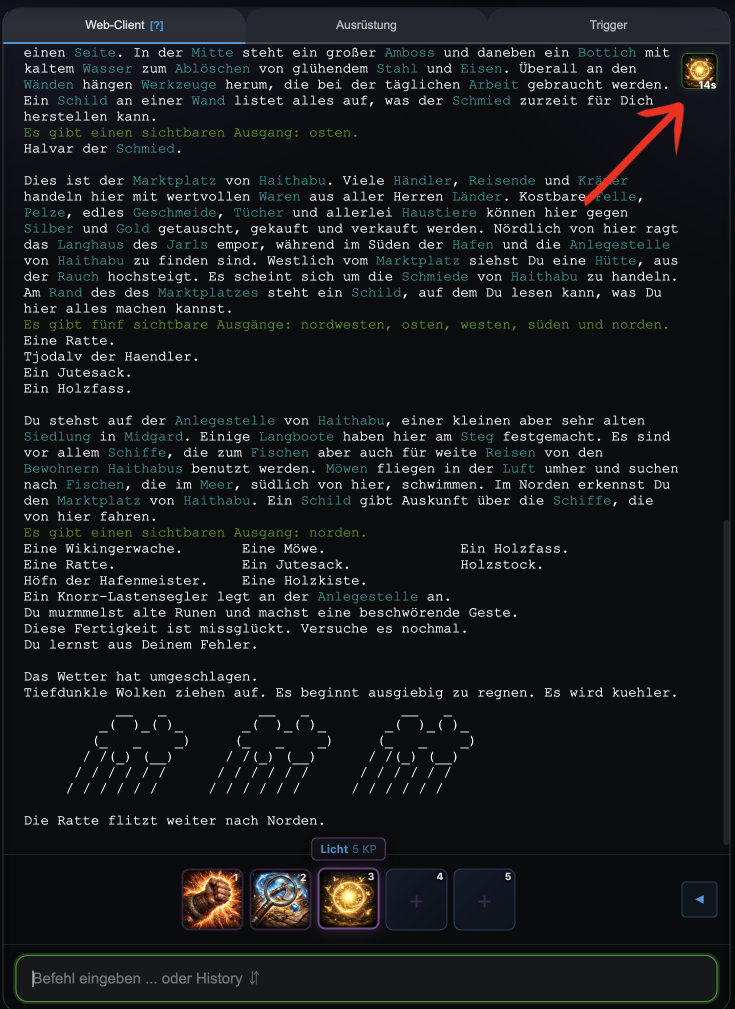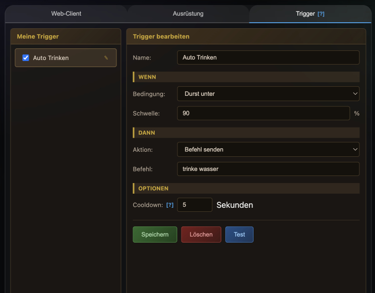 Neu: Das neue Trigger-System im Midgard Web-Client ermöglicht automatische Reaktionen auf Spielereignisse – ohne externe Tools oder Plugins. Spieler können Trigger erstellen, die auf bestimmte Texte reagieren (z.B. "Du bist hungrig" → automatisch essen), bei niedrigen Werten aktiv werden (LP unter 50% → heilen) oder zeitgesteuert Befehle senden. Alle Trigger werden im Browser gespeichert und sind beim nächsten Login sofort wieder aktiv. Eingebaute Schutzmechanismen wie Cooldown und AFK-Erkennung verhindern dabei Spam und Missbrauch. ✧ WebClient Exclusive