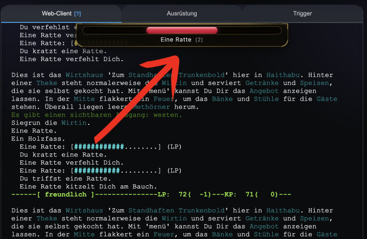 Neu: Der NPC-Lebensbalken zeigt dir während des Kampfes in Echtzeit die verbleibenden Lebenspunkte deines Gegners als grafischen Balken oben im Terminal an. So erkennst du auf einen Blick, wie viel Schaden du bereits angerichtet hast und ob sich ein Kampf noch lohnt oder du besser fliehen solltest. Der Balken erscheint automatisch bei Kampfbeginn und verschwindet, wenn der Gegner stirbt oder flieht. Du kannst ihn jederzeit in den Einstellungen unter "NPC-Lebensbalken" ein- oder ausschalten. Auch ohne Web-Client siehst du den Lebensbalken direkt im Kampftext als Textbalken am NPC — die grafische Anzeige im Web-Client ist eine zusätzliche Darstellung. ✧ WebClient Exclusive