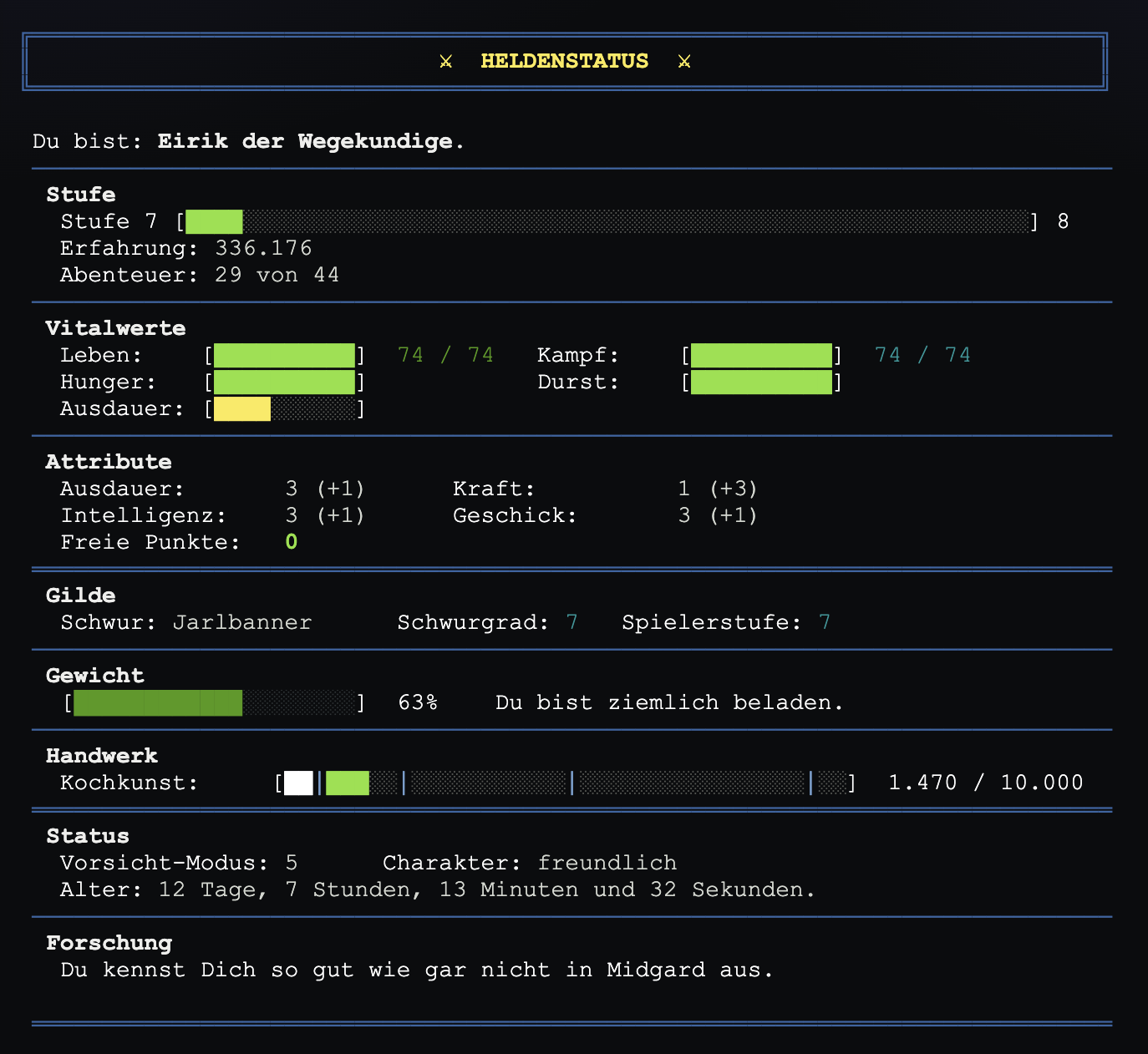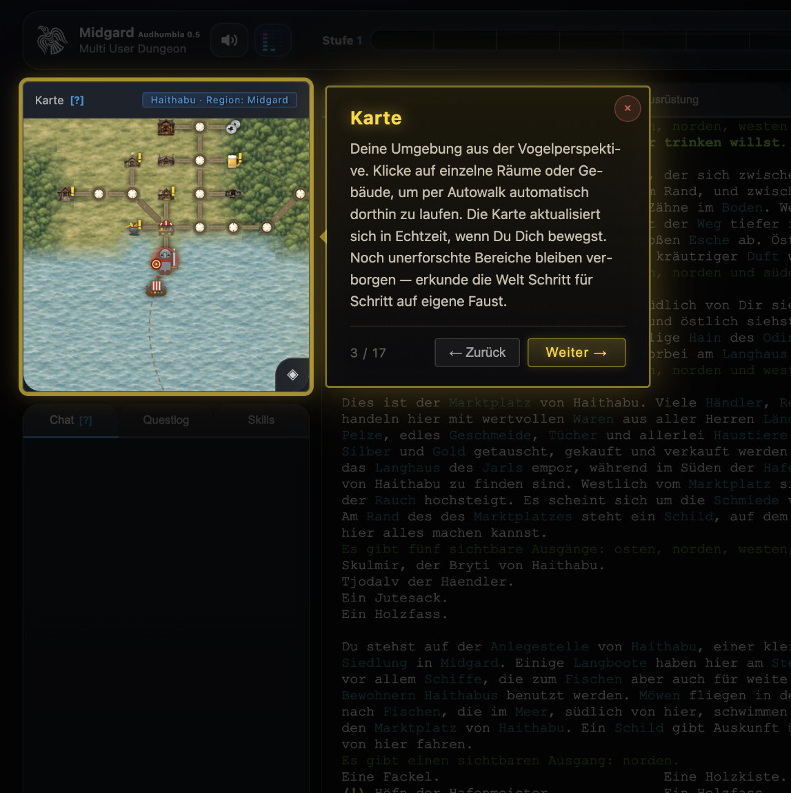 Neu: Quest: "Frodkonas Weihe". Im Kynningarhus zu Haithabu lehrt Dich Frodkona, die Hüterin des Wissens, alles, was Du zum Überleben in Midgard brauchst. Du lernst Bewegung, Erkundung, Kommunikation, den Umgang mit Gegenständen und Ausrüstung, Kampf, Kochen und Versorgung — Schritt für Schritt in einem Rundgang durch zehn Übungsräume. Als Belohnung erhältst Du eine Handaxt, Lederhelm, ein Rezept für Sauerkraut und 6 Abenteuerpunkte, die Dir einen frühen Vorsprung beim Aufstieg verschaffen. Schreibe Dich bei Frodkona in der Eingangshalle ein mit 'schreibe mich ein' — die Ausbildung lohnt sich ab der ersten Stufe!