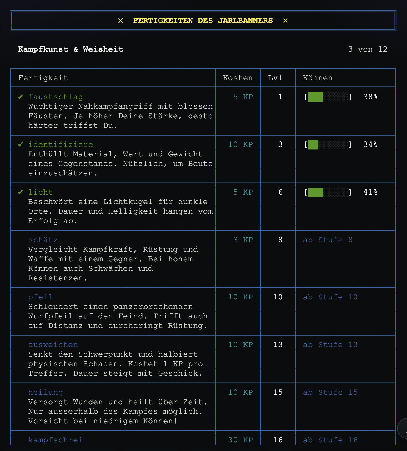 Neu: Die Abenteuergilde heißt ab sofort Jarlbanner — der Schwur der Freien unter dem Banner des Jarls. Mit der Umbenennung kommen zwölf überarbeitete Fertigkeiten: der neue Nahkampfangriff Faustschlag, die Wundbehandlung Heilung und der verheerende Flächenangriff Rundumschlag sind nur einige davon. Bestehende Fertigkeiten wie Schätz verraten jetzt Resistenzen und Schwächen eurer Gegner, und Schnell skaliert nun in drei Stufen je nach Können. Mit dem Befehl 'lerne' im Heiligen Hain des Odin seht ihr eine übersichtliche Tabelle mit Fortschrittsbalken, Kosten und Beschreibungen aller Fertigkeiten.