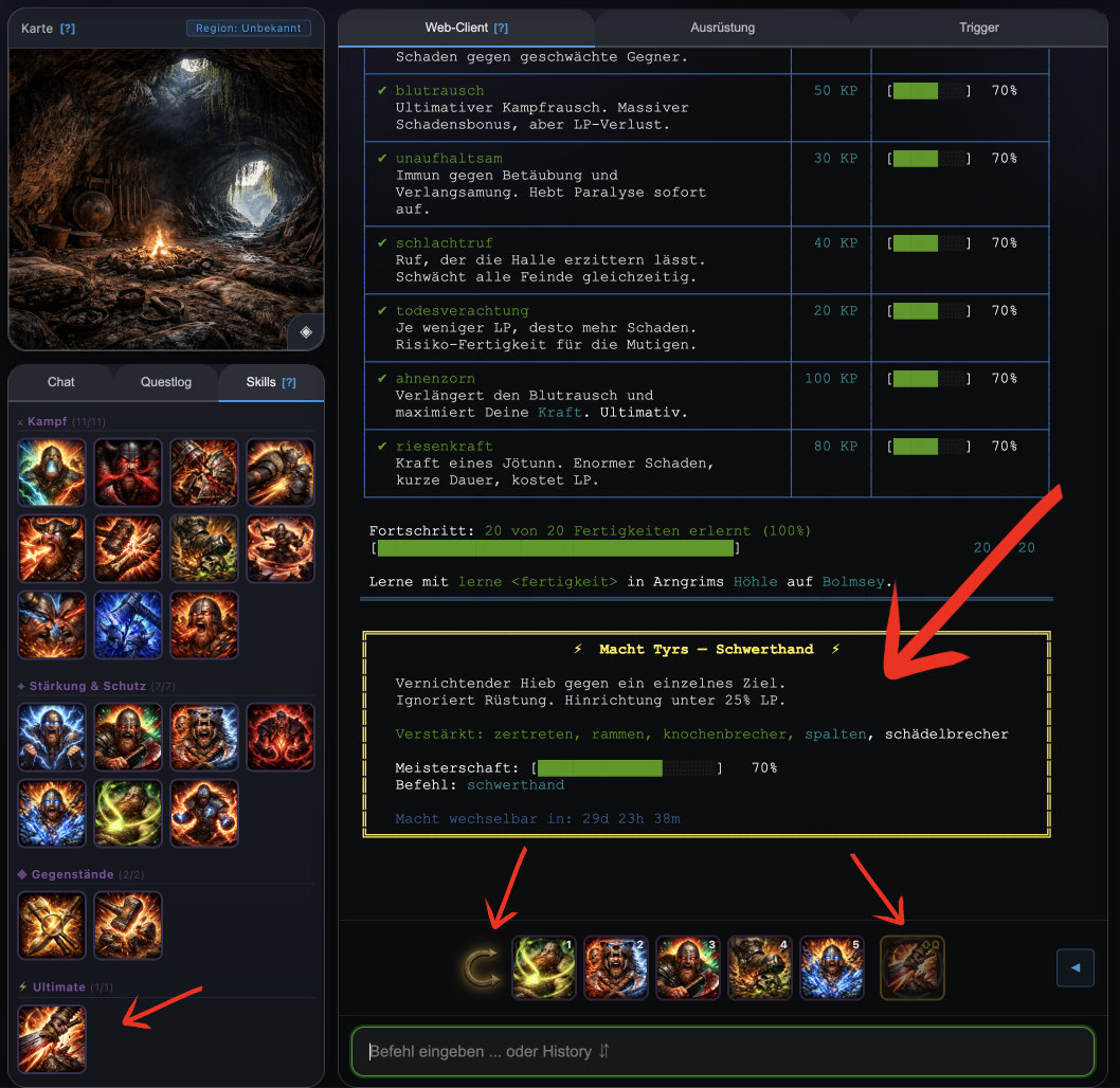 Neu: Ab sofort werden Details in Raumbeschreibungen cyan hervorgehoben und sind damit direkt anklickbar. Ein einfacher Mausklick führt automatisch die passende Aktion aus - je nach Detail wird untersucht, gerochen oder gelauscht. Das erspart eine Menge Tipparbeit und macht das Erkunden von Midgard deutlich komfortabler. Besonders in detailreichen Räumen lohnt es sich, die farbig markierten Begriffe durchzuklicken - so verpasst man garantiert nichts mehr! ✧ WebClient Exclusive