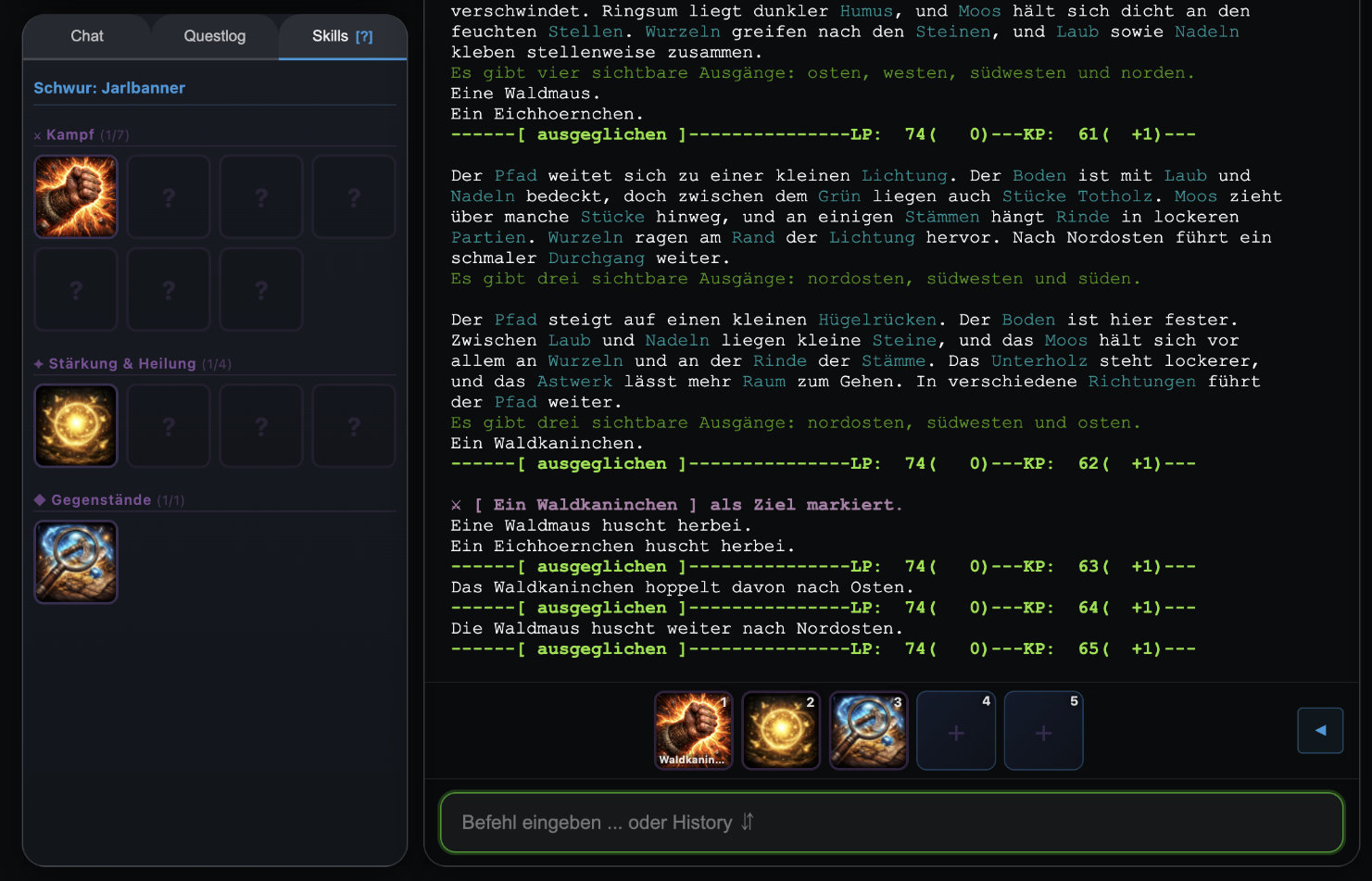 Neu: Der Web-Client unterstützt jetzt eine intelligente Autovervollständigung direkt in der Befehlszeile. Während du tippst, erscheint ein grauer Vorschlag, den du mit der Tab-Taste oder der Pfeil-rechts-Taste übernehmen kannst. Die Funktion kennt nicht nur alle MUD-Befehle, sondern auch die Namen von NPCs und Gegenständen im aktuellen Raum sowie die Items in deinem Inventar. So kannst du zum Beispiel "frag tjo" tippen und "tjodalv" wird automatisch vorgeschlagen – das spart Zeit und verhindert Tippfehler. ✧ WebClient Exclusive