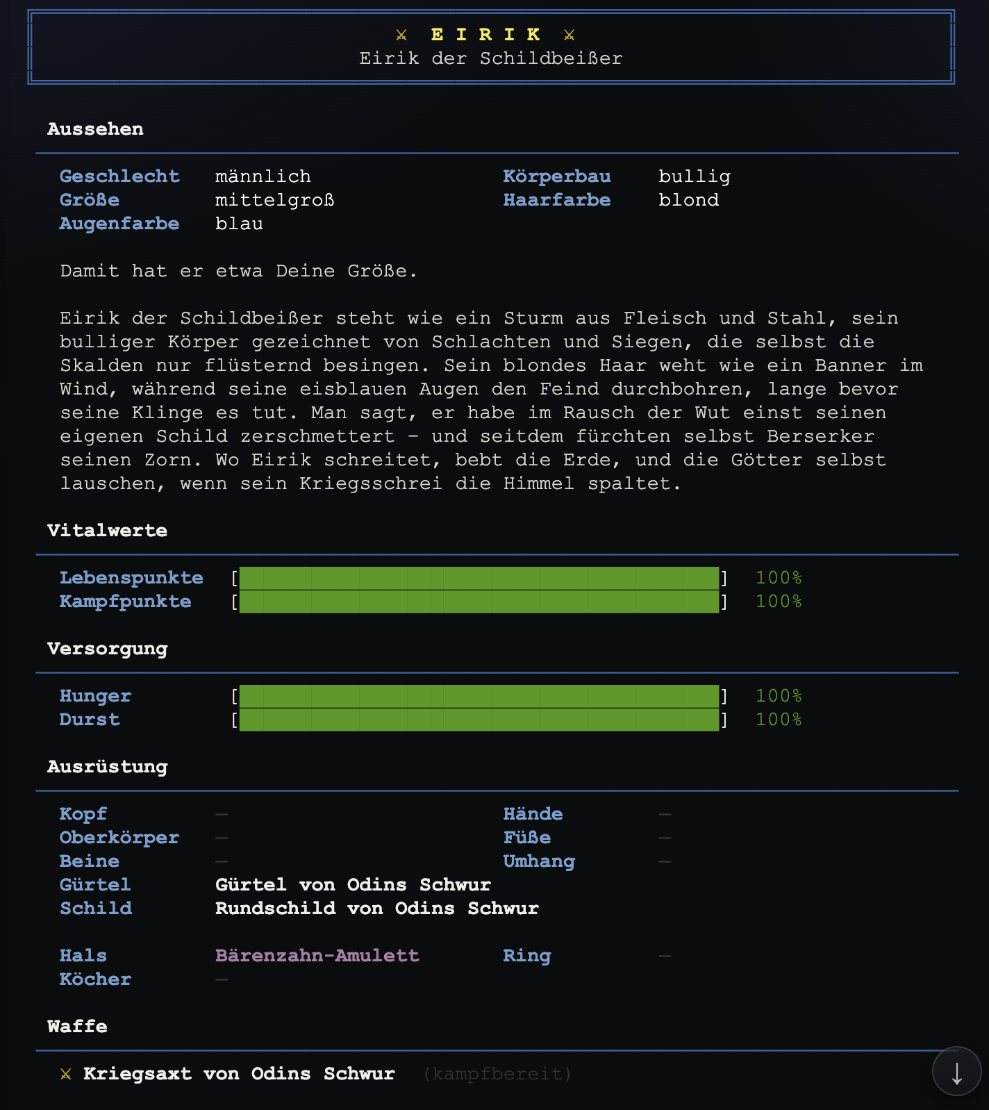 Überarbeitung: Charaktererstellung: Übersichtlich, klar strukturiert und intuitiv – so gelingt dir der perfekte Start in Midgard. Wir haben bewusst auf eine endlose Auswahl an zwanzig Augenfarben, dreißig Frisuren, Schmuck oder Tattoos verzichtet. Warum? Weil dein Charakter nicht im Menü entsteht – sondern in deinen Abenteuern in Midgard. Viele besondere individuelle und kosmetische Merkmale kannst du dir in Bälde direkt im Spiel verdienen: als Belohnung für Quests, durch Erfolge oder als Zeichen deiner Geschichte. Dein Aussehen wächst also mit deinen Taten und macht deine Saga noch bedeutungsvoller. Gerade für Neueinsteiger im MUD-Bereich bietet die schlanke Charakter-Erstellung einen klaren, unkomplizierten Einstieg. Kein Überfordern, kein langes Grübeln – sondern direkt hinein in die Welt, in deine Geschichte, in dein Abenteuer. Das ist eine bewusste Entscheidung für immersiveres Game-Design.