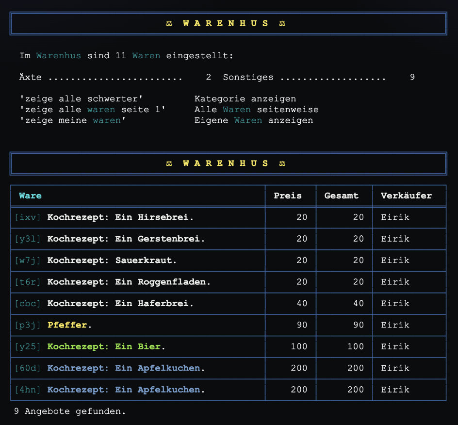Überarbeitung: Warenhus: Jetzt alles UTF8 und schöneres Ingame-Design. Bei großem Angebot zeigt das Warenhus Dir zuerst eine Kategorieübersicht — so findest Du Schwerter, Äxte, Rüstungen oder Sonstiges mit einem Blick. Die Warentafel erstrahlt jetzt in klarer Runenkunst mit farbigen Rahmen, und jede Ware behält ihren eigenen Glanz. Wer zu viel Plunder einstellen will, wird von der eigenen Stufe gebremst — ein Jarl darf mehr anbieten als ein Knecht. Ob Du nun „zeige alle äxte" rufst oder seitenweise durch hundert Angebote blätterst: Haithabus Handel war nie so übersichtlich.
