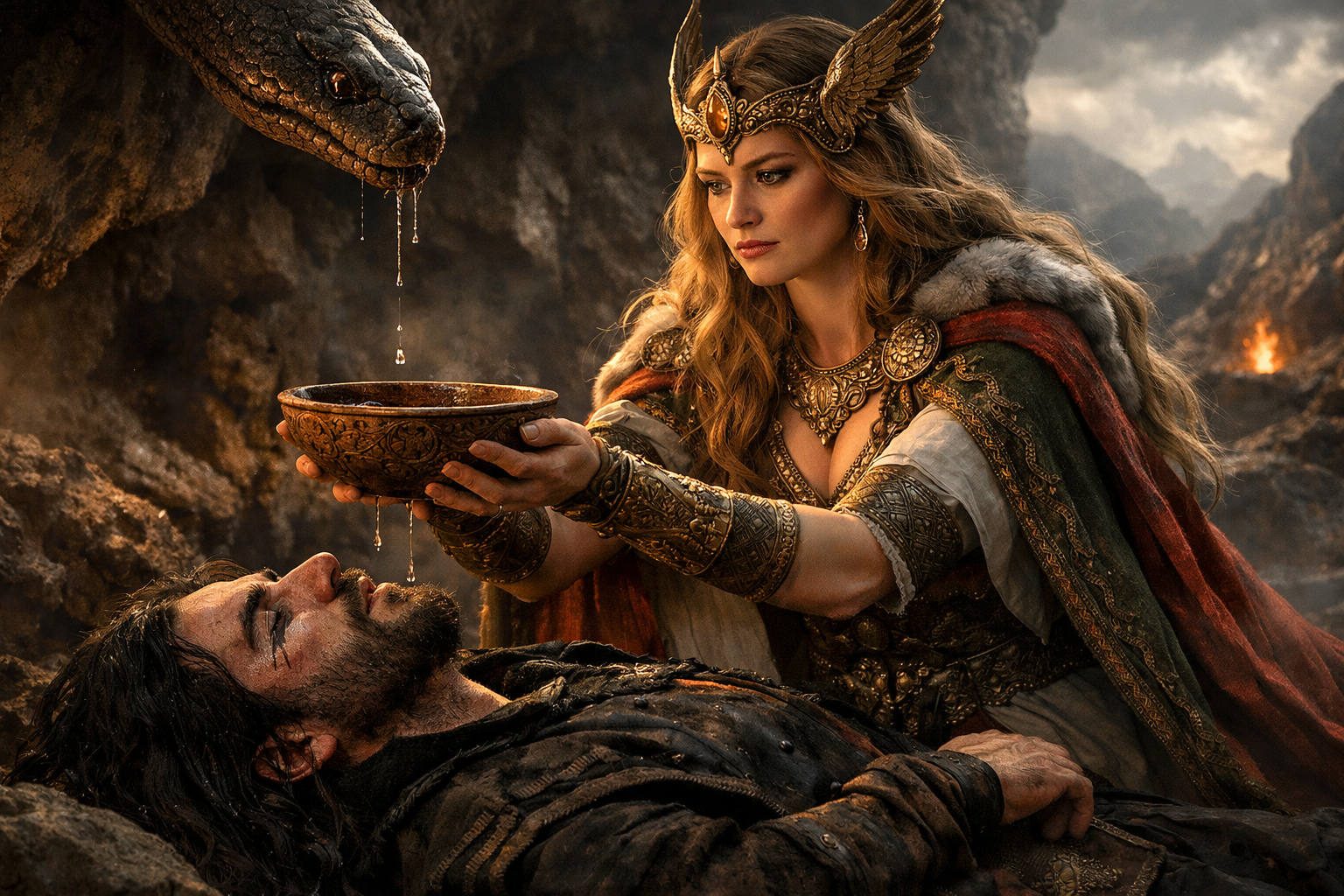 Sigyn steht in der Dunkelheit, die Schale in den Händen, und hält die Welt zusammen.